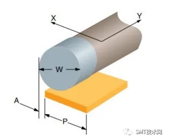 可接受:側(cè)面偏出(A)小于或等于元器件直徑(W)的25%,或焊盤寬度(P)的25%,取兩者中的較小者